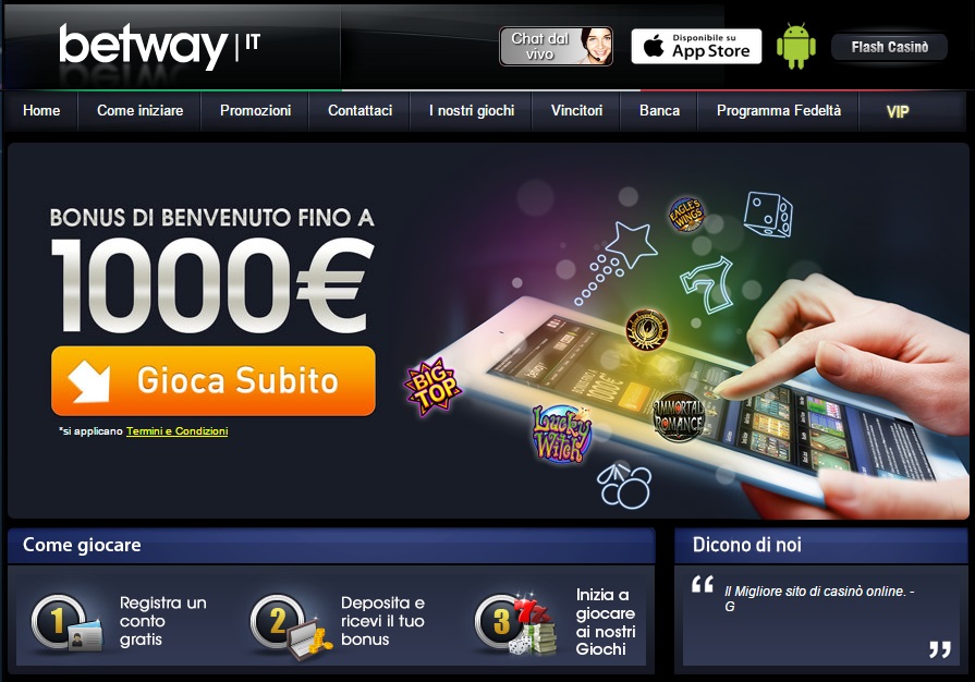 Betway IT è un elegante casinò online integrato nella rete di gioco europea Betway Limited. Il sito offre un’ampia selezione di slot, giochi da tavolo e video poker alimentati dal software Microgaming. Tutti i giochi sono accessibili tramite il software gratuito scaricabile o direttamente sul sito (flash). Alcuni dei loro giochi possono essere riprodotti sulla maggior parte degli smartphone e tablet in commercio. Betway è autorizzato AAMS con una regolare licenza.