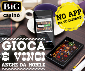 BIG Casinò ti permette di giocare dal tuo dispositivo mobile senza scaricare software con un bonus fino a €3000. €10 GRATIS se ti registri con il nostro codice BIG10FREE e €20 ancora omaggio quando invii il tuo documento.