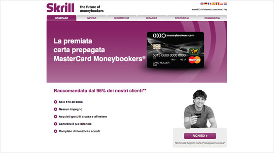 Il Portafoglio Digitale Skrill garantisce sicurezza e comodità nei pagamenti online richiedendo solo un indirizzo e-mail e una password. Benvenuti alla nuova generazione di pagamenti online. La carta prepagata collegata direttamente al vostro Portafoglio Digitale Skrill per avere la completa libertà. Accettata in negozi online e offline e in oltre 1,5 milioni di sportelli automatici in tutto il mondo. Ordinala ora.