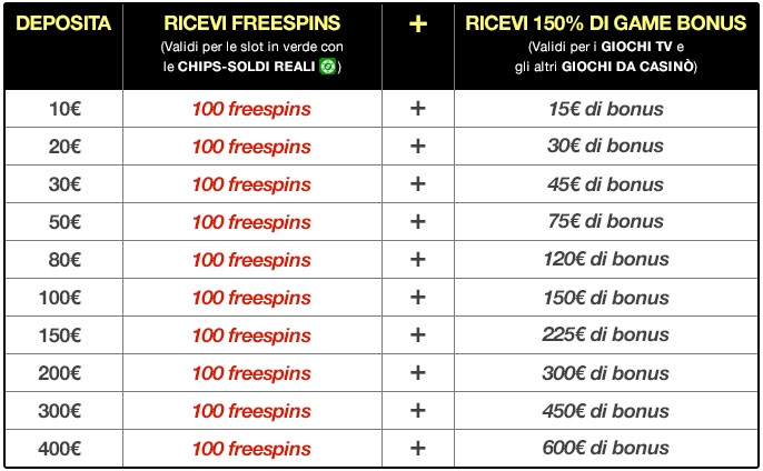 Inoltre, effettuando la tua prima ricarica, ricevi anche un game bonus del 150% fino a 600€ valido per giocare con le Roulette TV, già note sul canale 63 del digitale terrestre, a tutte le slot senza jackpot e a tutti gli altri giochi presenti nel casinò.